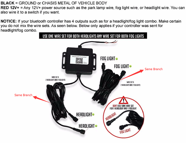 If your control box has 4 output connecting wires, please don't confuse the headlights and fog lights. The headlights and fog lights each occupy 2 of the main wires set. You cannot cross and mix the main wires. (as the picture shows).