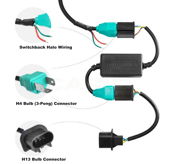 - LED Canbus” wire connector, with male 3‐prong plug on one end and female 3‐prong plug on other(Some With Built-in decoding function of the sealed beam headlamp).