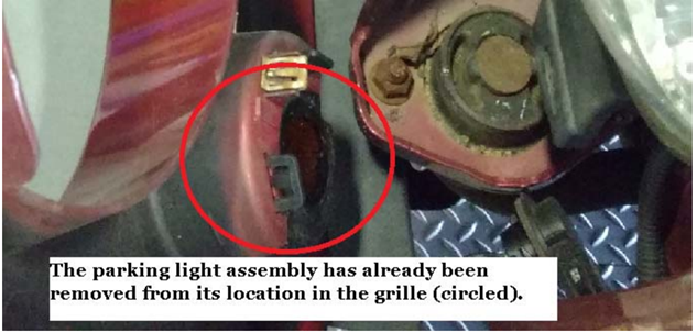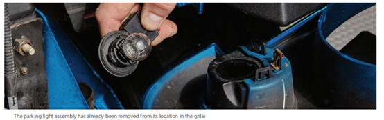 B.Gently pull the top of the grille outward, away from the car. Reach down and release the parking lamp bulbs and holders,by turning them a quarter‐turn. Keep them attached to the wire harness, and place them where they will not be damaged. (They can be left to hang in the opening between the bumper and the body of the Jeep)