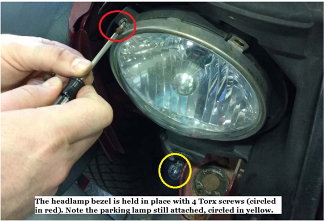 D.To remove the headlamps:- a. Remove the metal bezel ring, which is held in place with 4 screws. Use a T‐15 Torx bit/screwdriver.