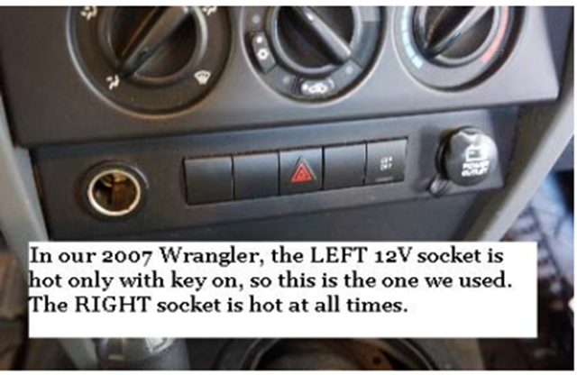 In our 2007 Wrangler, the LEFT 12 socket is hot only with key on, so this is one we used. The RIGHT socket is hot at all times.