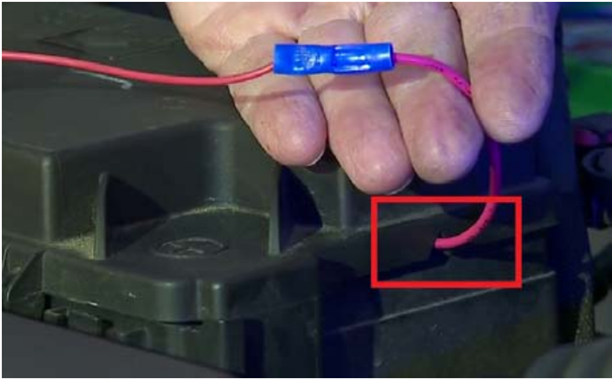 NOTE: It is important that lid fuse box lid can be closed completely. Once functionality has been confirmed, create a channel for the wire to pass through the fuse box wall without being pinched or the fuse box being compromised. The picture below shows the completed wire passing through the fuse box (red box). This channel was created using a triangular file.
