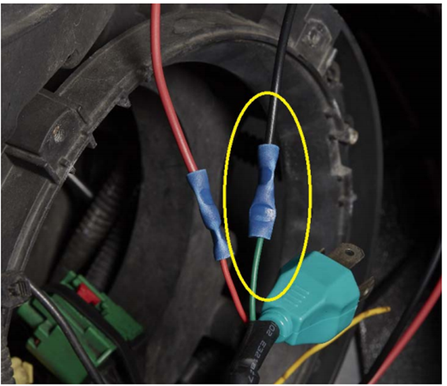 b.Ensure that this green/black wire passes through the headlight bezel opening. This is to prevent pinching of the wires during the headlight re-installation.