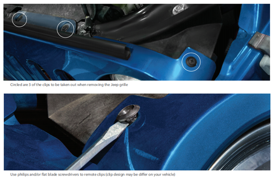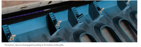 C.The bottom of the grille is held in place by clips. Gently pull on the bottom of the grille until the clips disengage;remove the grille from the car and put aside in a safe place.
