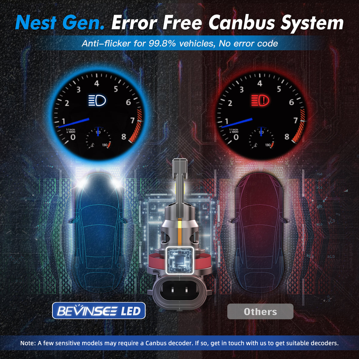 - 【Error-Free, Anti-Flicker】Bevinsee H11 LED bulb is built-in intelligent IC driver that works seamlessly with most vehicles' computer systems, ensuring no error codes or flickering issues. However, certain sensitive models may need a canbus decoder for optimal performance. If you have any questions or need assistance, please don't hesitate to message us.