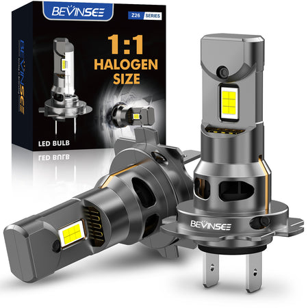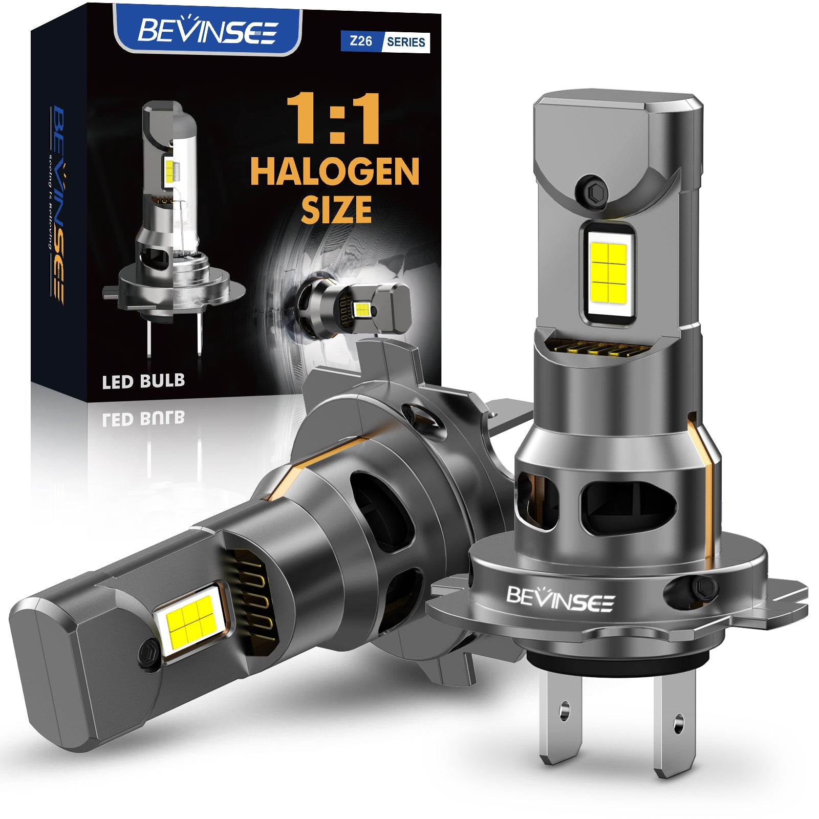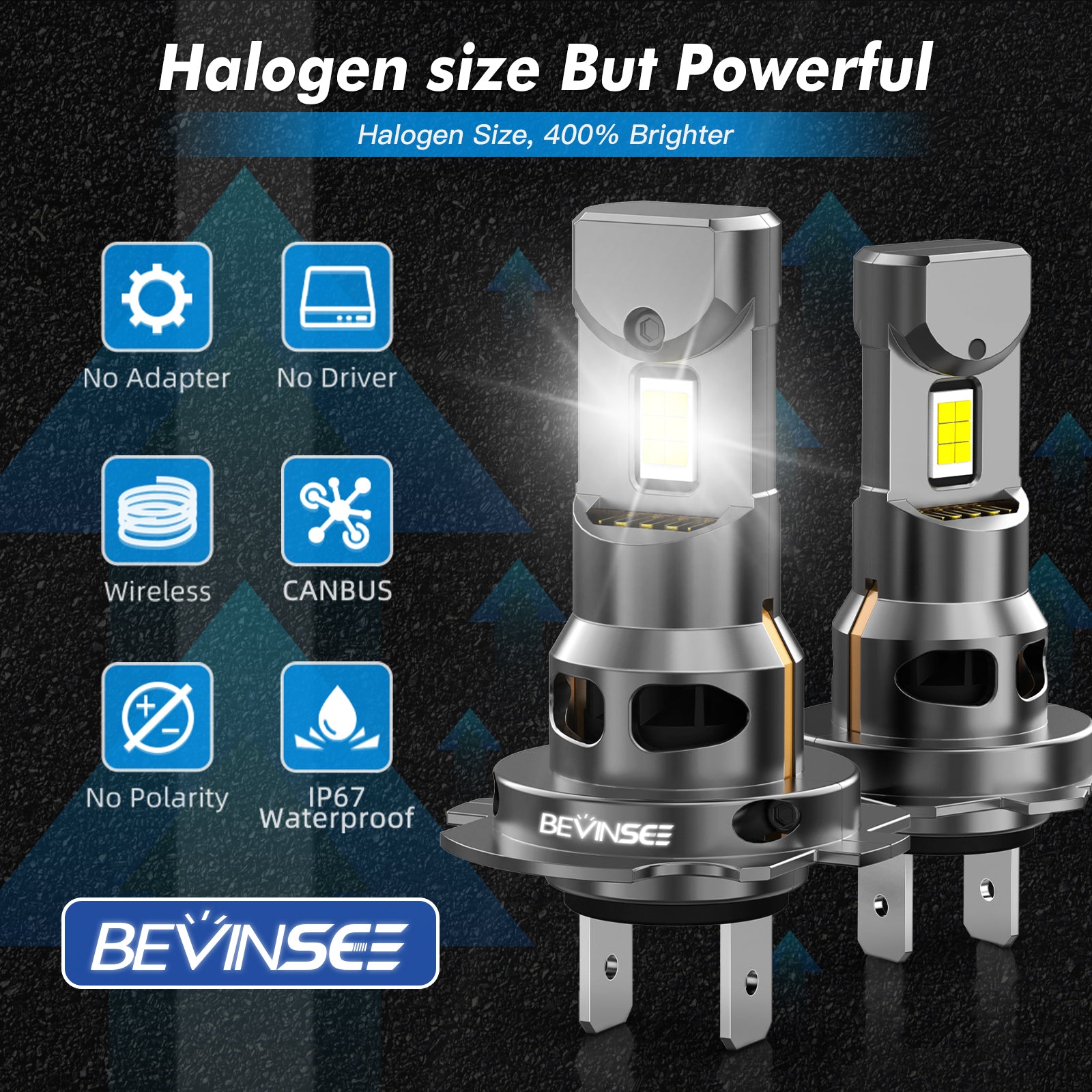 - 1.【Same Size as Halogen for Easier to Install】Really plug and play. Bevinsee H7 led headlight bulb is the 1:1 same size as standard H7 halogen bulbs, non polarity, no additional adapters required, no any external driver or rearward clearance for an oversized heatsink, so these h7 led bulbs will drop right into any H7 housing, making the installation a breeze.