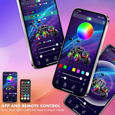 - DUAL CONTROL WAY: The whip light can be controlled by the remote control or APP Bluetooth, with multiple colors, multiple brightness, and flashing speeds for you to choose, which can realize the display effects of explosion flash, streamer, RGB color, and so on.