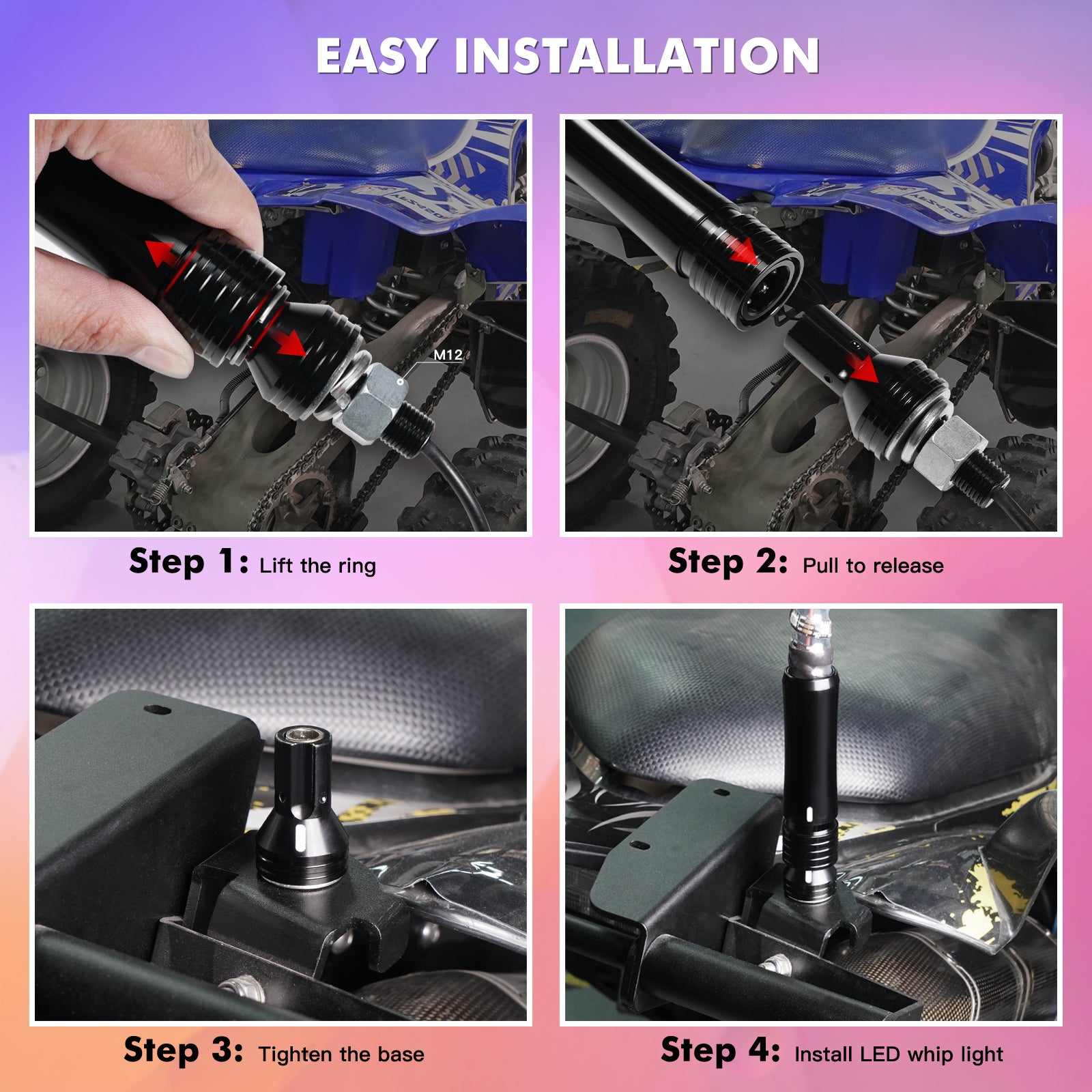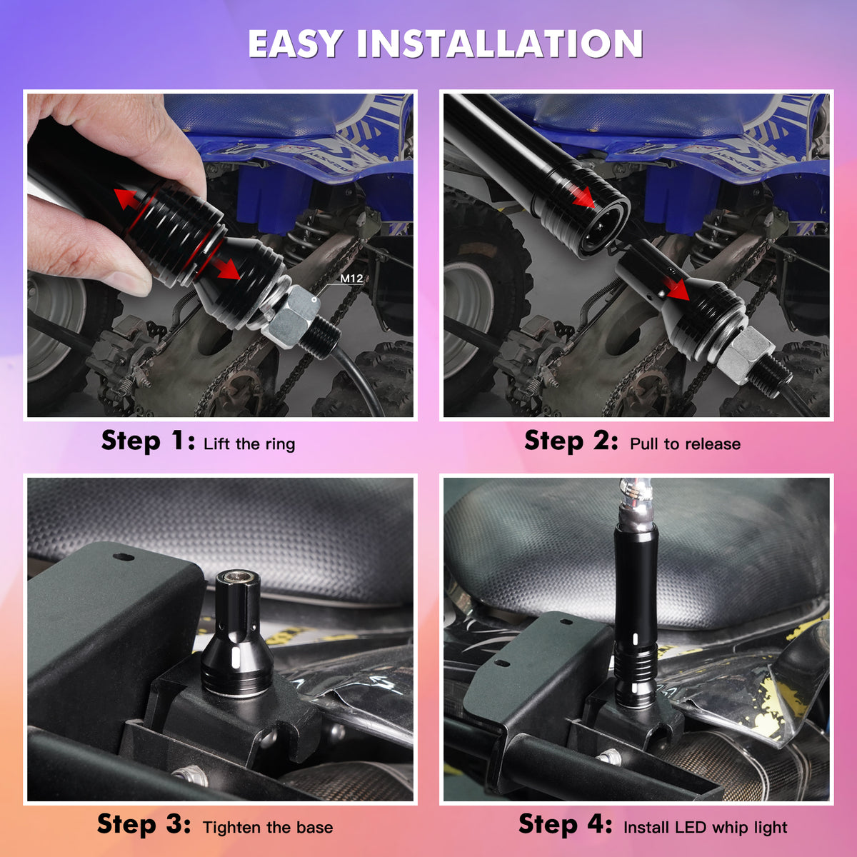 - EASY INSTALLATION: Unique base wiring design, easier to route and disassemble. You just need to install the whip light in the 12.5mm hole, then connect the base wire and whip light, and finally power on. Done in less than 10 minutes. (Please refer to the installation instructions or installation video)