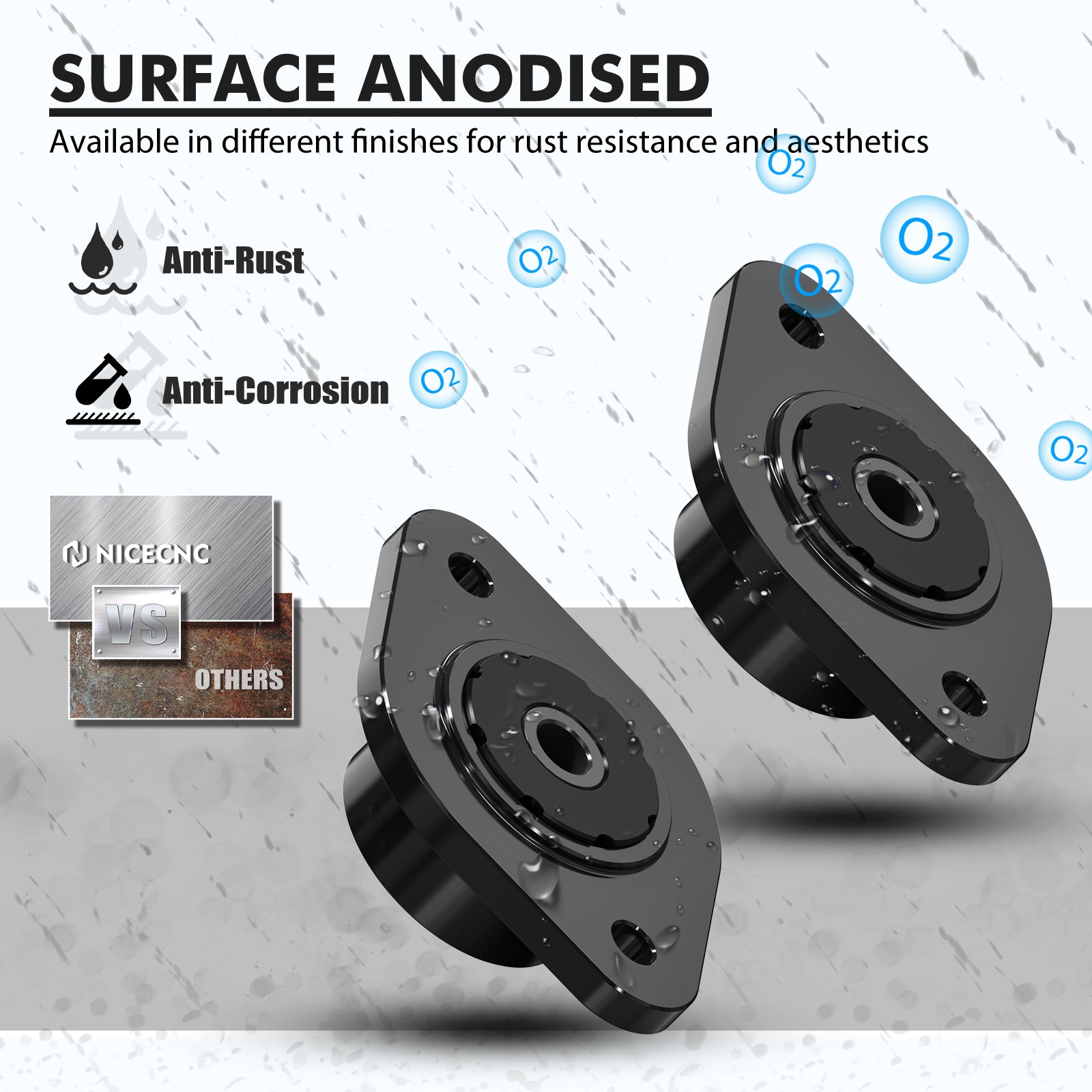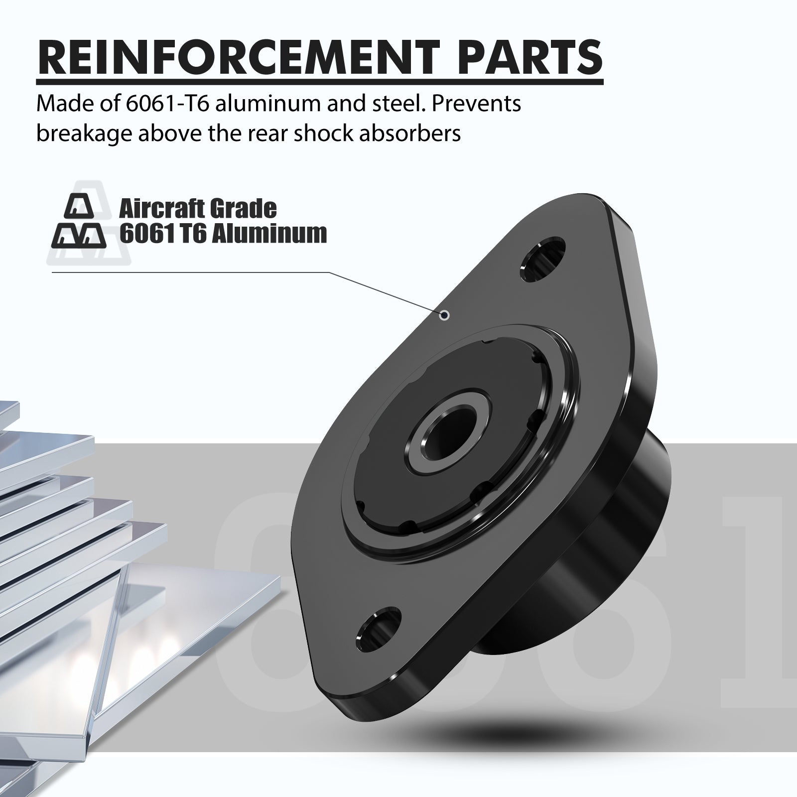 - High Performance - Eliminates deflection of factory shock mounts under load and reduces the negative effects from rear shock damping, especially with improved suspension and additional shock valves. Helps to keep the rear shock absorber in the proper position for its proper operation. Also improves ride experience by eliminating rear end knocking caused by rubber wear in the original rear shock mount.