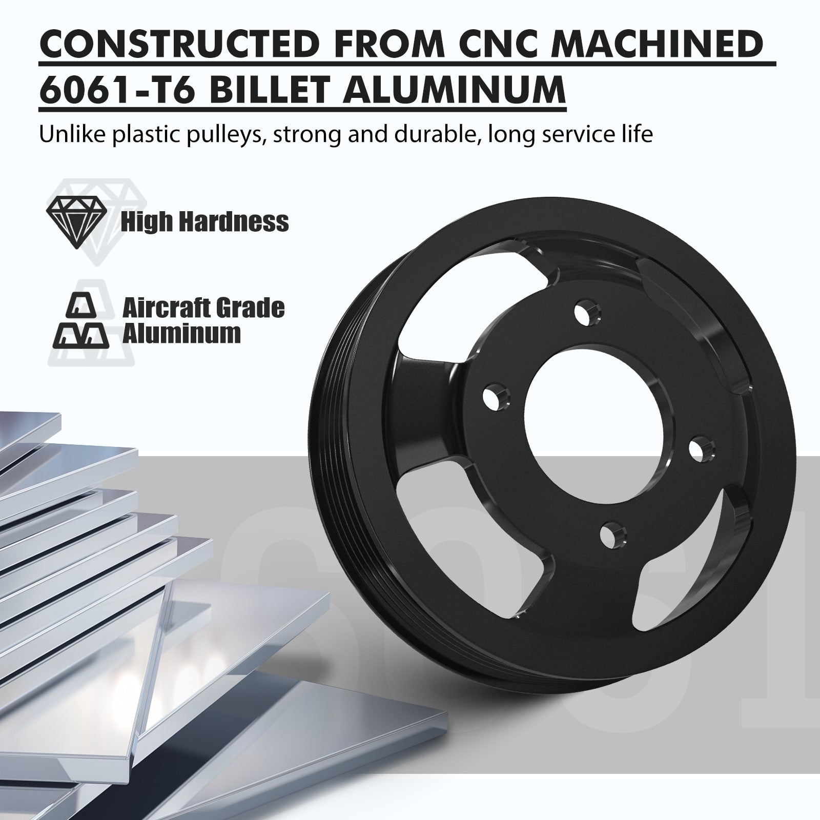 - Using the whole piece of 6061-T6 billet aluminum CNC, unlike plastic pulleys, strong and durable, long service life.