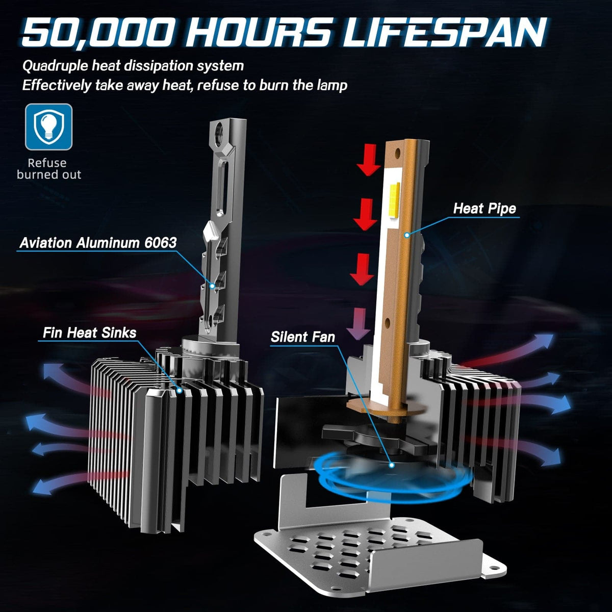 - 50000 HOURS LIFE: D1S LED headlights up to 50000hours lifetime, 10 times that of HID. Bevinsee adopts heat sinks, heat pipes and silent fan cooling system to effectively reduce the heat of the headlamp, protect the lamp shell, prevent aging and yellowing, and ensure that the led bulb can be used.