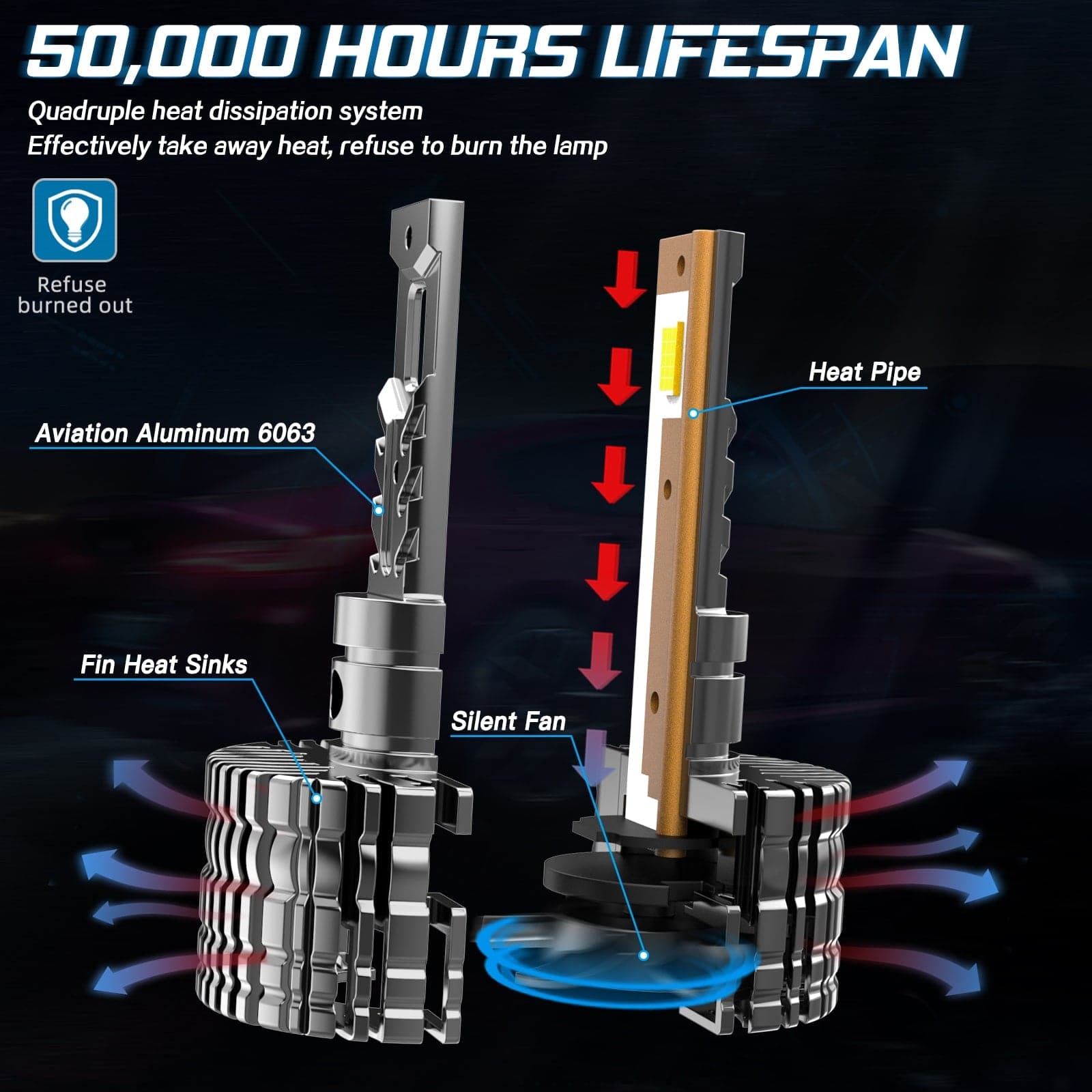 - 50000 HOURS LIFE: D2S LED headlights up to 50000hours lifetime, 10 times that of HID. Bevinsee adopts heat sinks, heat pipes and silent fan cooling system to effectively reduce the heat of the headlamp, protect the lamp shell, prevent aging and yellowing, and ensure that the led bulb can be used.