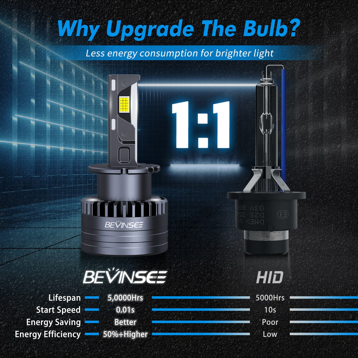 - [5 Min Effortless Installation] BEVINSEE D40 LED Bulbs are meticulously designed to be a perfect fit with a 1:1 design compared to original HID bulbs. They are directly compatible with your original HID ballast, no extra wires or external drivers needed.