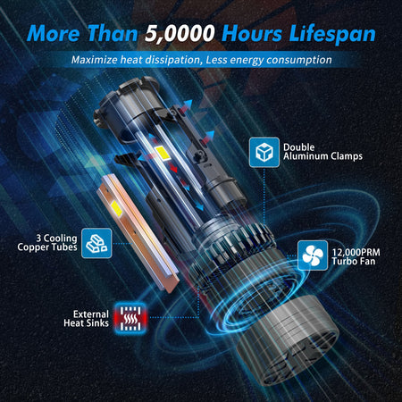 [More Efficient Cooling Capacity] Top-grade space aluminum housing+triple vacuum heat pipe+fin heat sink+12,000RPM turbo fan, provide maximize heat dissipation for the bulb housing. Less energy consumption for brighter light.