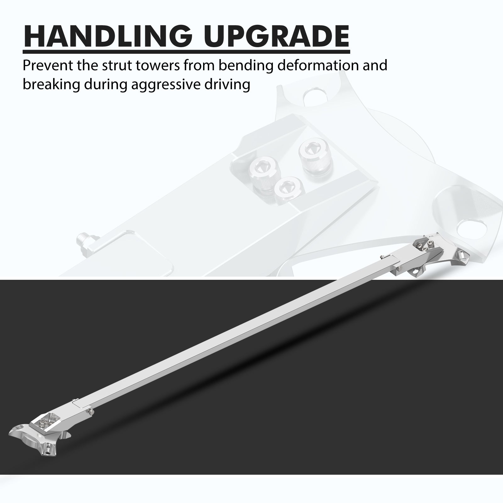 Strut tower bars are an excellent and common handling upgrade. Strut bars work by holding the shock towers together, prevents strut towers from bending and alignment changes during aggressive driving, reduced handling.