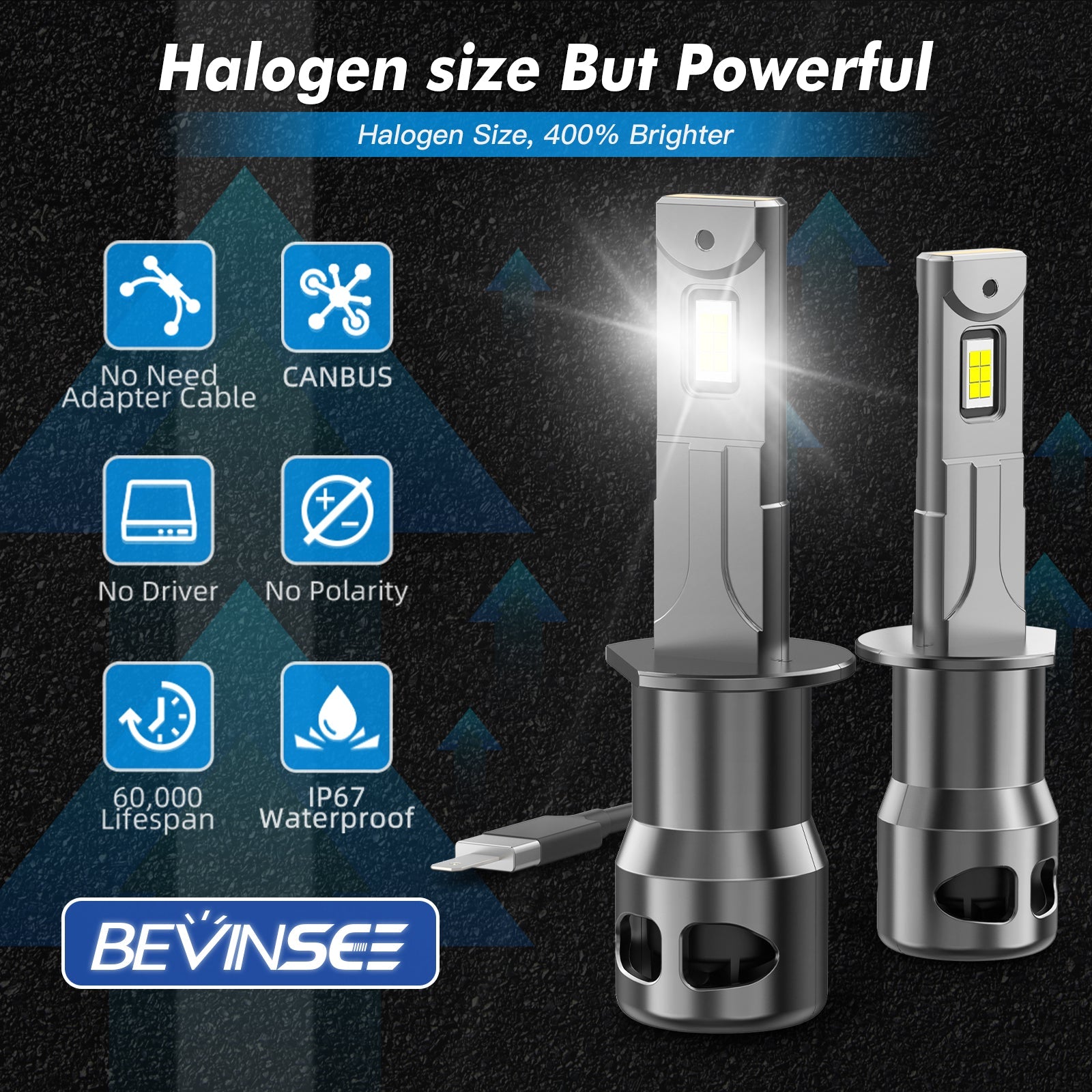 - Higher Brightness for Wider Vision - Bevinsee H1 LED headlight bulb is way brighter than the stock halogen bulbs, giving you a 400% increase in brightness. With 6000k clearer white light, H1 LED provides a better view and greatly improve your visibility on the road while driving, especially at night.