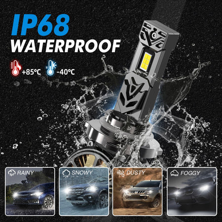 - 50000+HRS Lifespan: Featuring a 12,000PRM high-speed silent fan and aviation aluminum material whole hollow-carved design, S50 H7 adopts an advanced cooling system to extend the life of the bulb. The IP68 waterproof function allows you to drive normally in any bad weather, even in snowstorms and severe fog and haze.