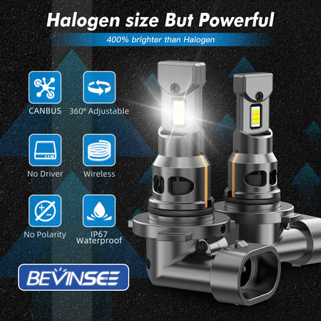- Same Size as Halogen for Easier to Install - Really plug and play. Bevinsee 9005 led headlight bulb is the 1:1 same size as standard 9005 halogen bulbs, non polarity, no additional adapters required, no any external driver or rearward clearance for an oversized heatsink, so these 9005 led bulbs will drop right into any 9005 housing, making the installation a breeze.