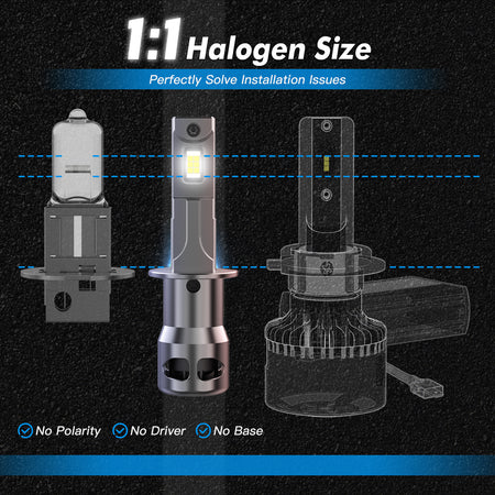 1. 【Same Size as Halogen for Easier Installation】 Truly plug and play. Bevinsee H3 LED headlight bulb is 1:1 same size as stock H3 halogen bulbs, no polarity, no extra adapters required, no external driver or clearance to the rear for an oversized heat sink, so these H3 LED bulbs will drop right into any H3 housing, making installation a breeze.