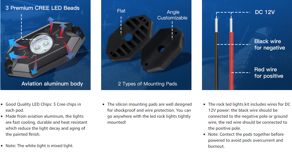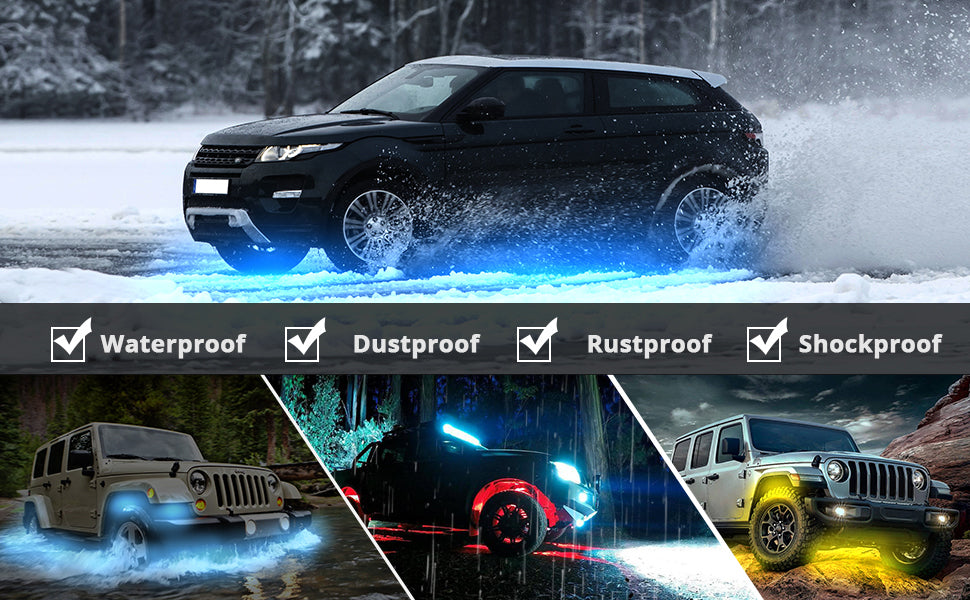 - 【Rock Solid Construction】These underglow rock lights, made from Aviation aluminum, are given many protections such as IP 67 waterproof, dustproof, rust-proof, high durability and fast-cooling which protects the lamps well for up to 50000 hours' life.
