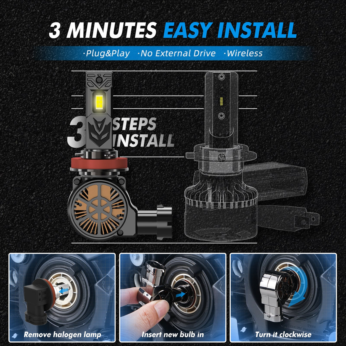 【99% Vehicles Compatibility】BEVINSEE S50 LED Headlight bulb upgraded the internal intelligent IC driver and improved performance to fit most vehicle systems. Mostly close to the wattage of halogen bulbs to reduce the occurrence of CANBUS problems. No error warning, No more flicker and radio interference.