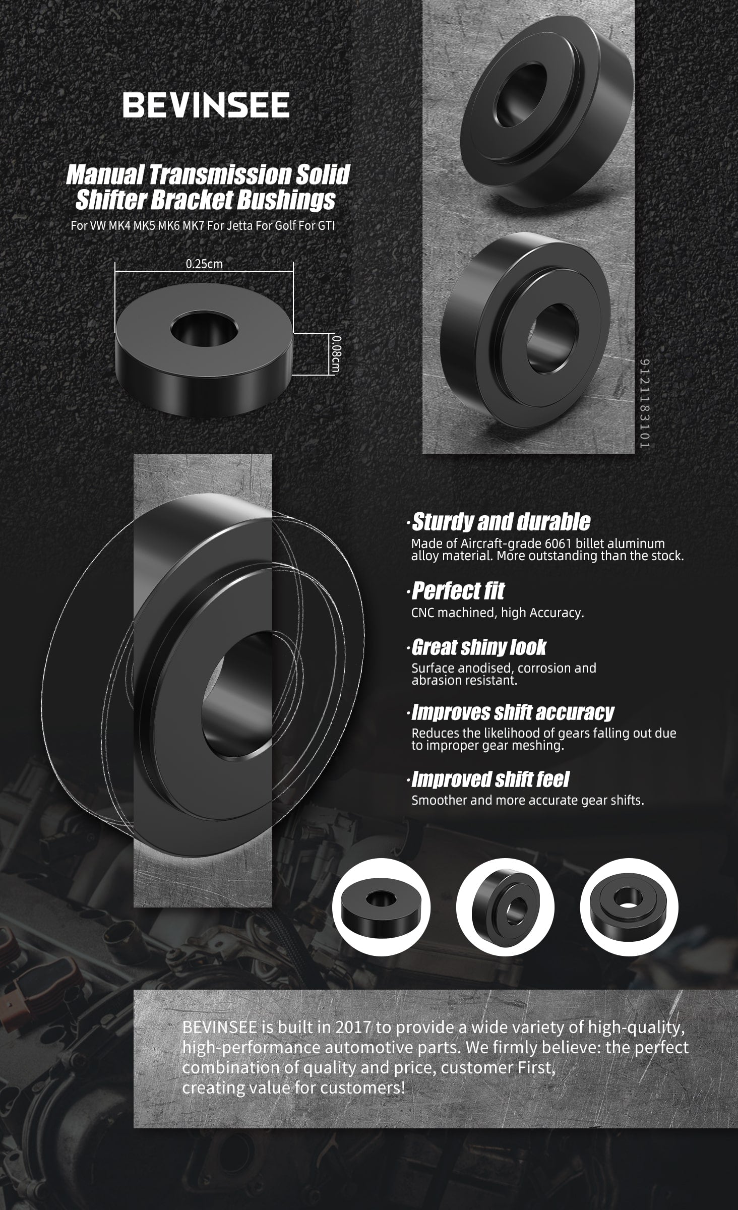 BEVINSEE solid bushings are a direct upgrade replacement for the stock rubber bushings in the shifter bracket for all VW 02A, 02J, 02M and 02Q transmissions.
