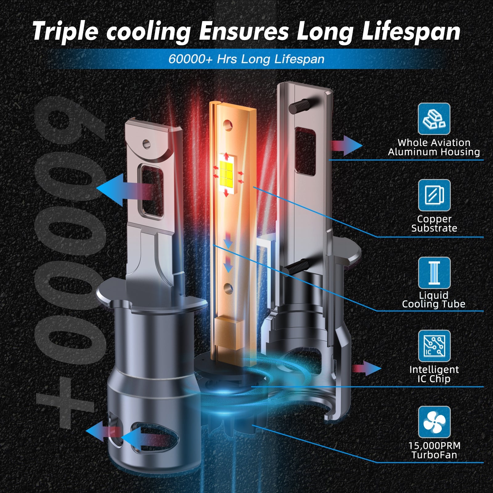 7-Year Long Lasting Lifespan - With its triple cooling system, H3 LED headlight bulb can last up to 7 years. Whole aviation aluminum body design, intensive fin heat sinks, and 15,000RPM silent turbofan ensures efficient cooling. This facilitates H3 LED headlight bulb to work consistently and extends its lifespan to 60,000 hours. Say goodbye to the hassle of frequently replacing bulbs.